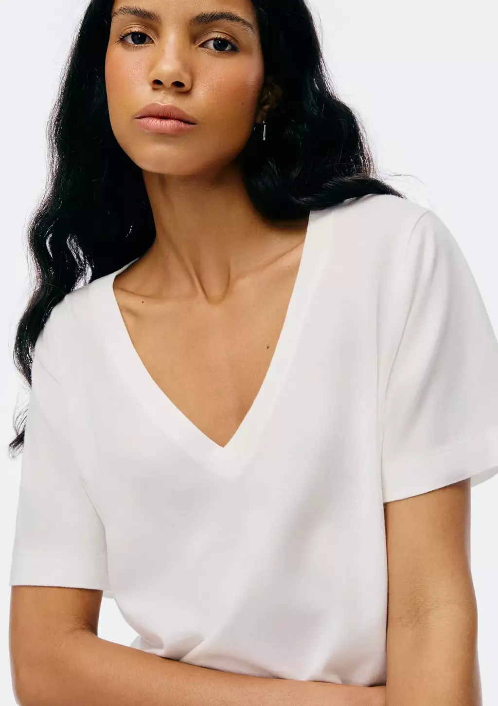 Blusa feminina em malha com lavanderia, deixando a cor mais suave e toque macio. Possui manga curta e decote V em ribana.