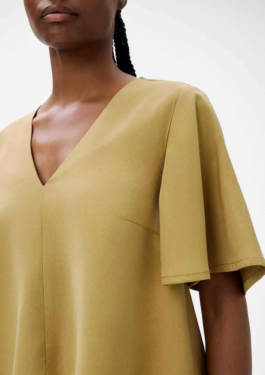 Blusa elaborada em tecido com toque macio como pêssego. Suas mangas amplas e costas mais longas que a frente oferece um caimento fluído e elegante.