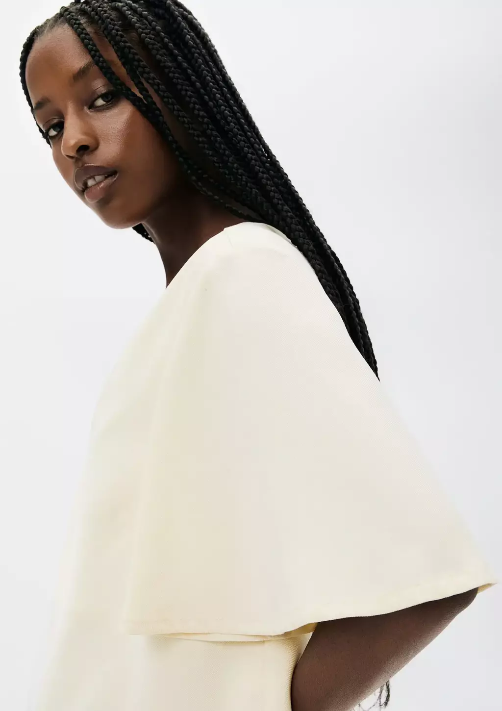Blusa elaborada em tecido com toque macio como pêssego. Suas mangas amplas e costas mais longas que a frente oferece um caimento fluído e elegante.