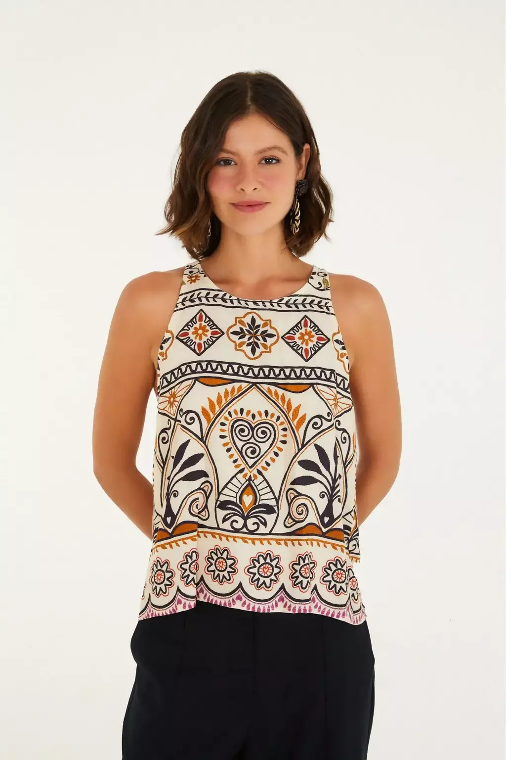 regata estampada adriele. com alças médias e decote redondo, a modelagem reta proporciona conforto e leveza. o tecido fluido valoriza o movimento, tornando-a ideal para eventos casuais ou um passeio ao ar livre.