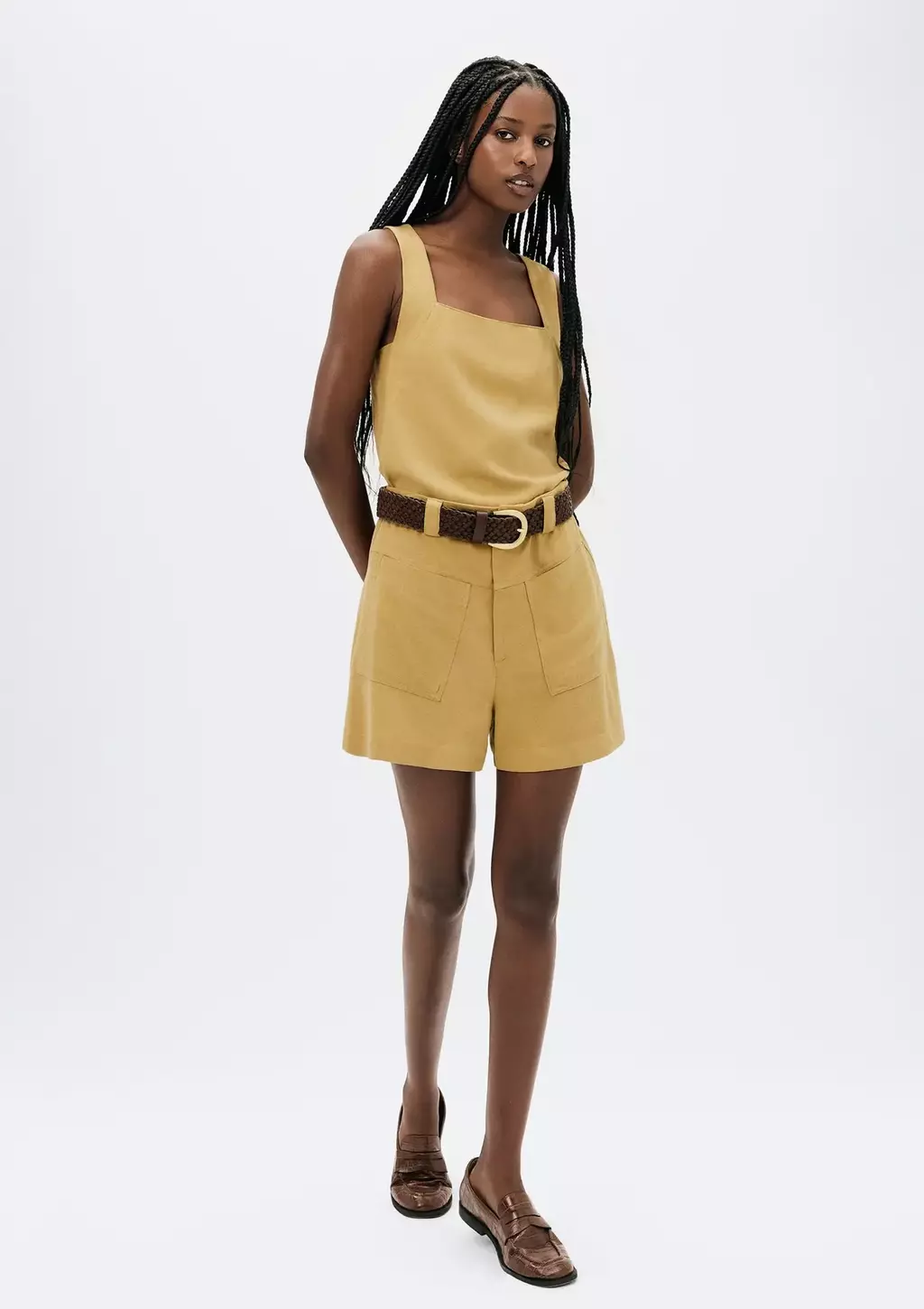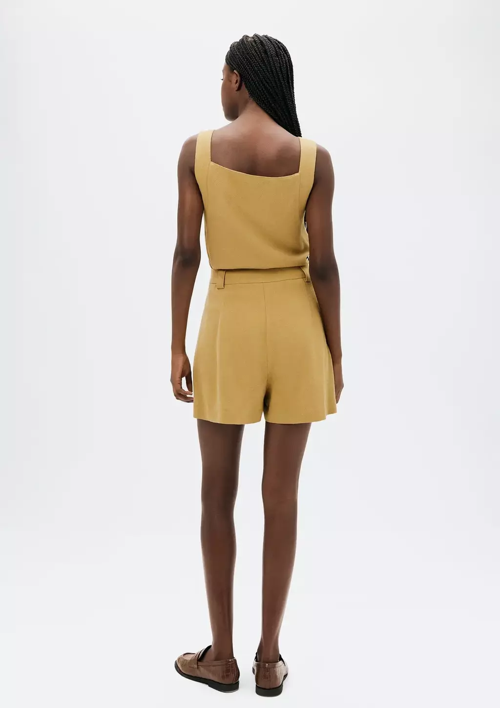 Shorts confeccionado em viscolinho com modelagem evasê, sendo levemente mais largo na barra. Possui cós com botão de metal e braguilha, pala frontal com aplicação de bolsos, gancho levemente deslocado e cintura média.
